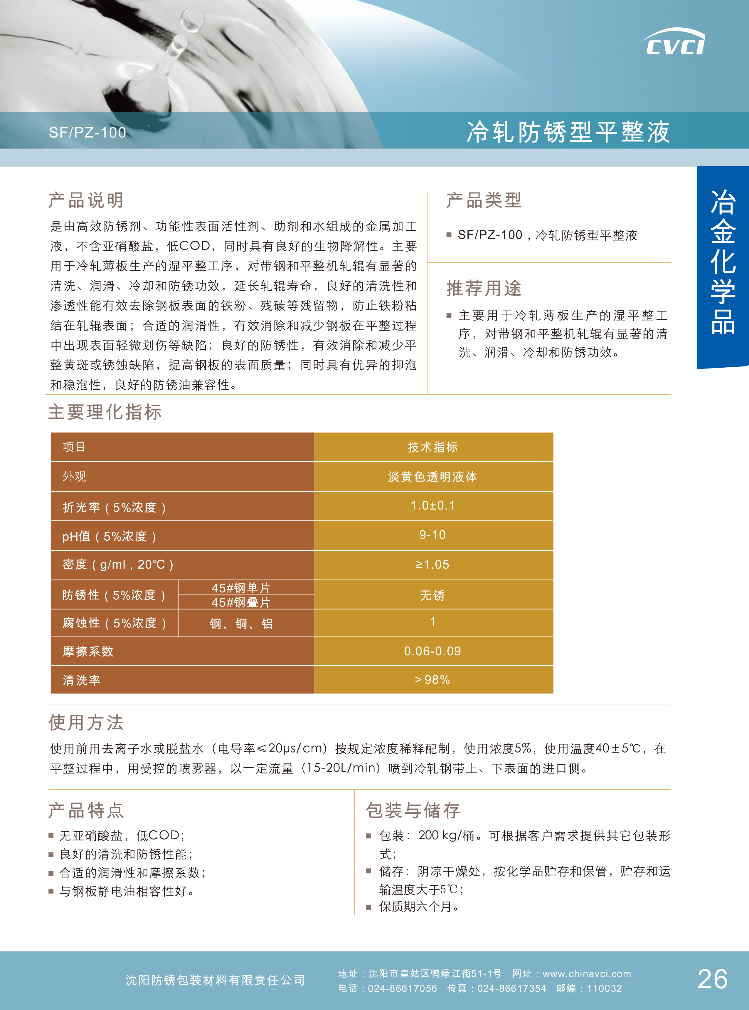 平整液SF/PZ-100,是由高效防銹劑、功能性表面活性劑、助劑和水組成的金屬加工液,不含亞硝酸鹽,低COD,同時(shí)具有良好的生物降解性。